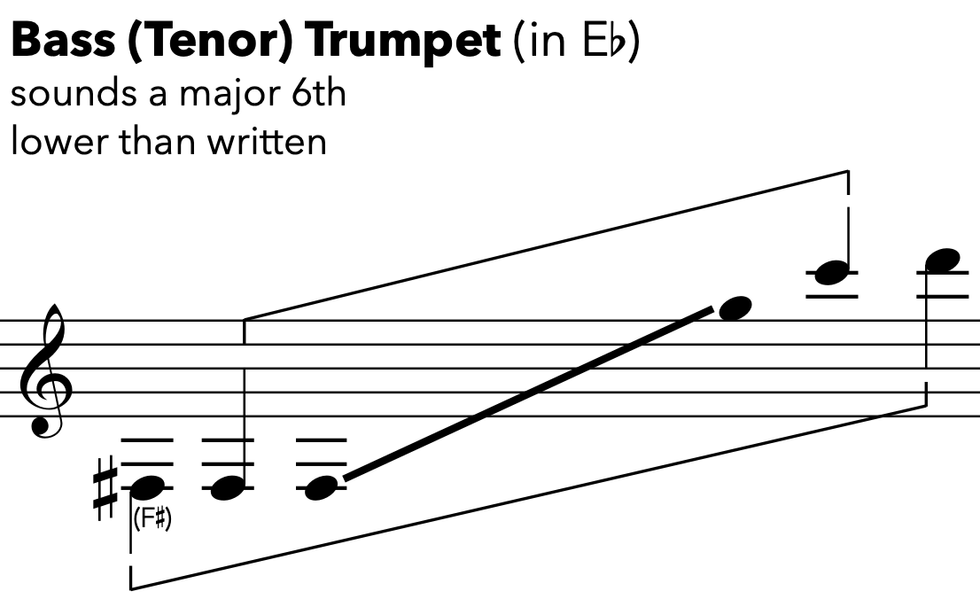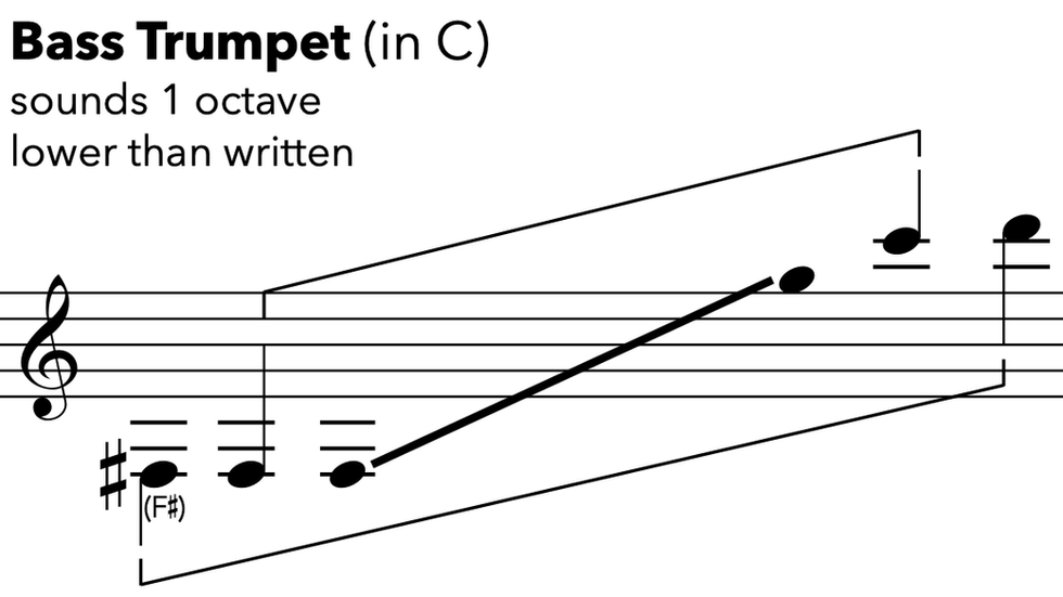 Bass clefs may appear in the score for lower trumpets, but the performer's part should always be written in treble clef